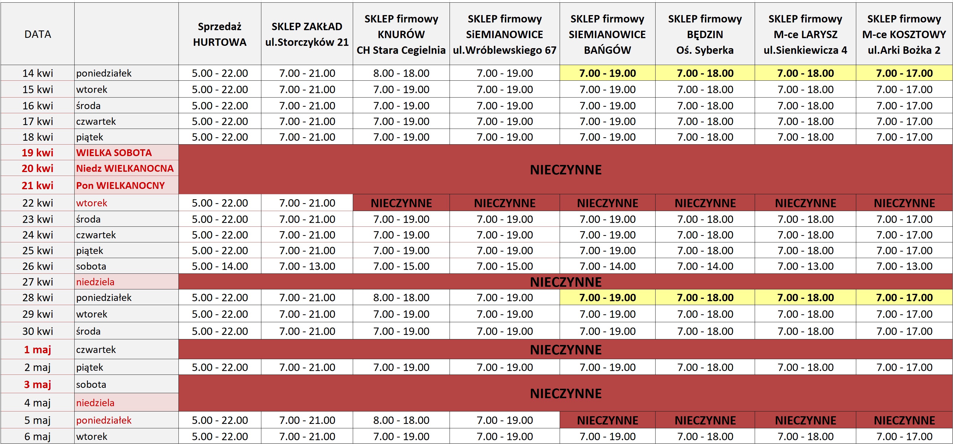 Sprawdź godziny otwarcia naszych punktów sprzedaży w okresie Świąt Wielkanocnych oraz Majówki, aby móc zaplanować swoje zakupy z wyprzedzeniem: